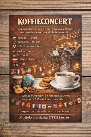 LOSSER – Muziekvereniging DTKS verzorgt op zondag 19 april een koffieconcert in Café Heijdemann. Tijdens deze ochtend staan zowel ervaren muzikanten als nieuw talent gezamenlijk op het podium.
