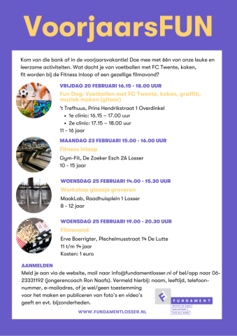 Fundament organiseert ook dit jaar weer VoorjaarsFUN: een afwisselend en gezellig programma voor kinderen en jongeren in de voorjaarsvakantie. Met de oproep “Kom van die bank af!” wordt de jeugd uitgenodigd om mee te doen aan allerlei sportieve, creatieve en gezellige activiteiten.