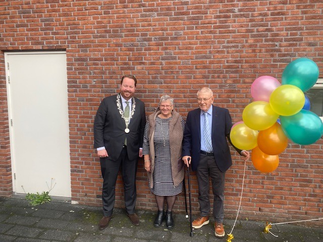 Burgemeester Jeroen Diepemaat feliciteerde het bruidspaar namens de gemeente en bracht een prachtig boeket mee.