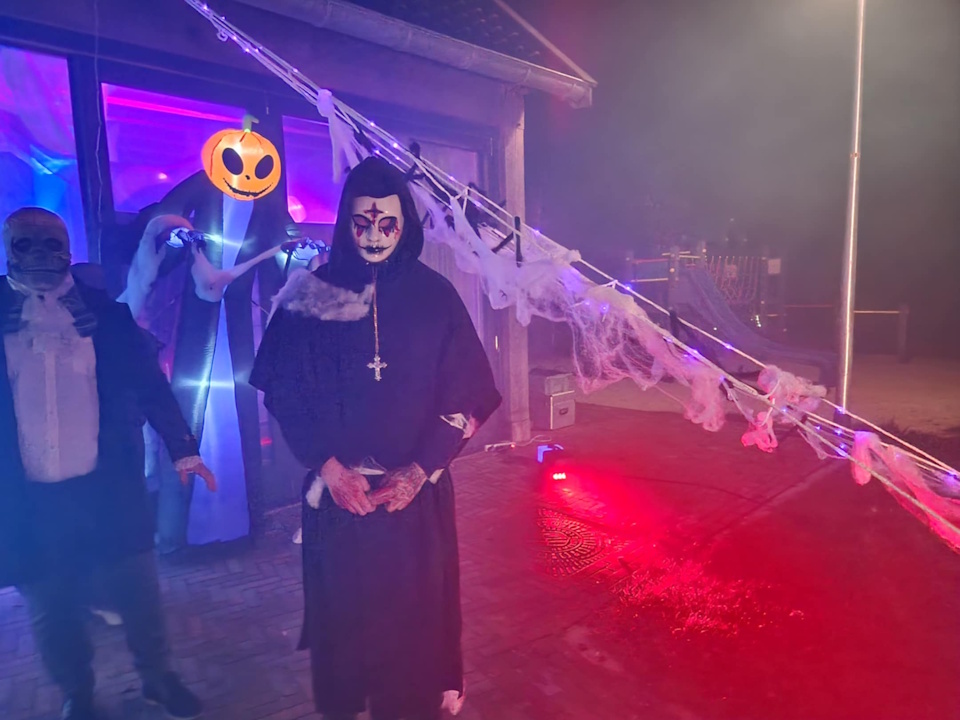Het plein was prachtig versierd in Halloweensfeer dankzij de familie Van der Werf, die het dorpshart omtoverde tot een mystieke plek vol lichtjes en spoken. Ook ouders en vrijwilligers droegen hun steentje bij aan een avond vol spanning, samenwerking en gezelligheid.