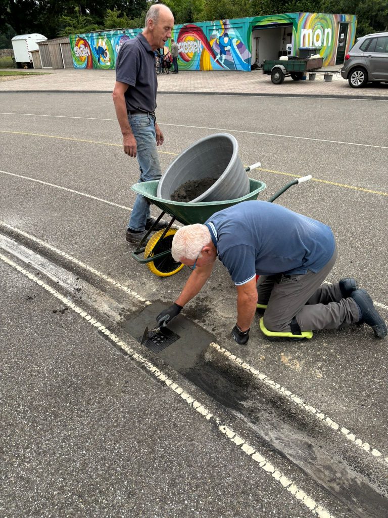 Na veel interne discussie en raadplegen van externe deskundigen is deze zomer besloten te starten met het vervangen van alle 24 aan-/afvoerputjes in de baan. Een hels karwei voor de groep ijsmeesters. Vol verwachting werd de baan daarna onder water gezet om te kunnen beoordelen in hoeverre deze klus effect heeft gehad. Het resultaat was hoopgevend maar nog steeds onvoldoende voor een mooie ijsperiode. Daarom is na overleg met een bevriende wegenbouwer een specialist ingeschakeld voor het dichtmaken van de bijna 1100 meter aan grote en kleine scheuren in de baan. Tot dat moment was het beeld dat de wel degelijk goed zichtbare scheuren niet dwars door de 3 lagen asfalt liep. Deze beeldvorming bleek na reparatie in belangrijke mate onjuist. Uit de test na afloop van alle werkzaamheden is duidelijk geworden dat de baan weer zo goed als waterdicht is. Dit tot grote opluchting van de groep mensen die hiermee erg druk is geweest.