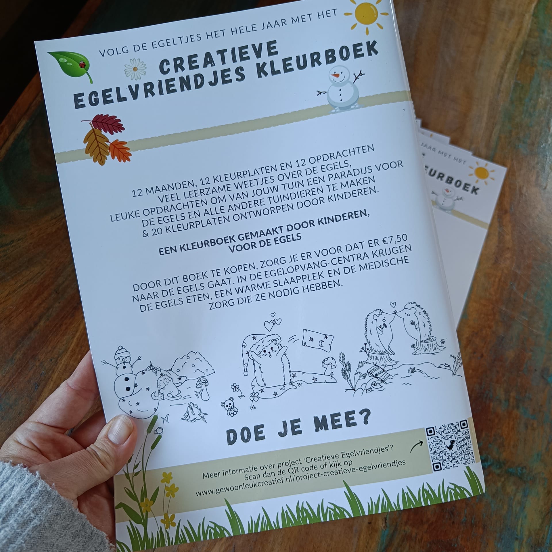Het kleur-, maar eigenlijk ook doeboek Creatieve Egelvriendjes is nu klaar! Ze doneren de boeken aan verschillende egelopvangcentra, zodat zij deze zelf kunnen verkopen en de opbrengst dus zo direct naar de egels gaat. Met de aankoop van dit kleurboek steun je de egelopvangcentra, die zich inzetten voor de opvang en verzorging van egels, maar kun je ook samen genieten én zelf de natuur en egels een handje helpen.