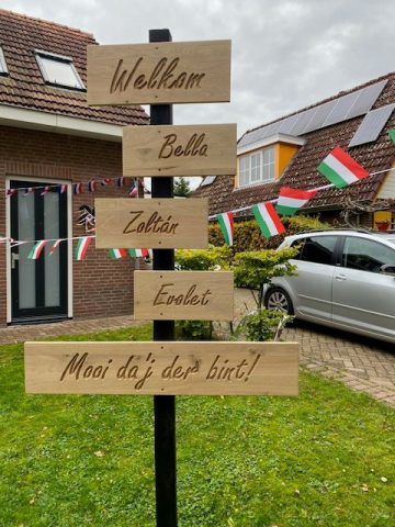Aan de Hogeboekelweg is een voortuin prachtig versierd. Er hangen tientallen Hongaarse vlaggetjes en er staan mooie welkomstteksten voor drie kinderen. De reden is bijzonder.