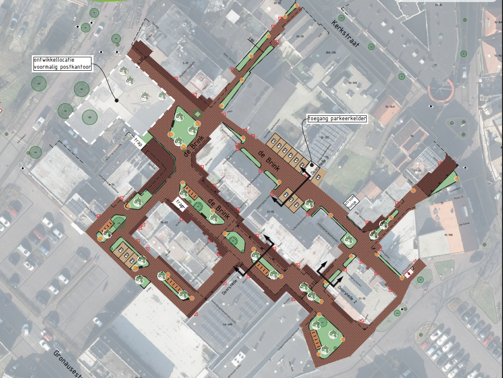 De ondernemers staan positief tegenover de vergroening van De Brink maar hadden problemen met de plaats en omvang van de groenperken. In de winkelstraat is aan beide zijden 4 meter ruimte (1,5 m voor de winkel en 2,5 trottoir). Daartussen 4 meter ruimte voor bomen en struiken.