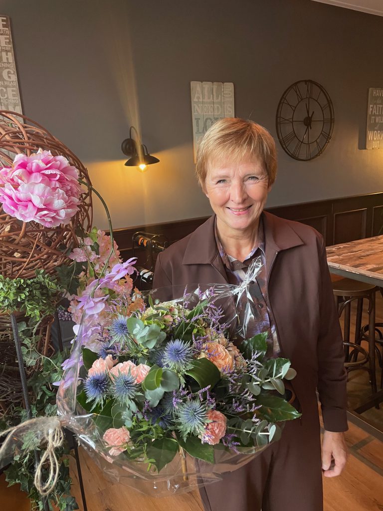 De koorleden togen vervolgens naar café/zalencentrum De Vereeniging voor een uitgebreide koffietafel. Hierna werd het enige jubilerende koorlid in de bloemetjes gezet. Voor 40 jaar koorzang mocht Jeanette Steunebrink een cadeau en een bos bloemen in ontvangst nemen. Voorzitter Marjon Koop maakte gewag van meer dan 3300 repetitie-uren en 2100 uren kerkgezang. Hier zijn de rouw- en trouwdiensten niet meegerekend.