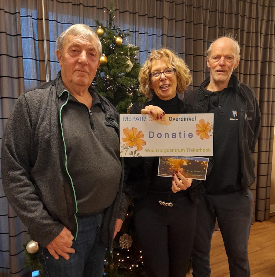 Afgelopen week is een delegatie van het Repaircafé Overdinkel gezellig bij het Woonzorgcentrum Tiekerhook op de koffie geweest om een mooi cadeau voor de kerstdagen langs te brengen. De heren hebben het afgelopen jaar tegen een vrije gift diverse reparaties verricht voor de inwoners van Overdinkel. Daarop ontstond het idee om wat terug te doen voor Overdinkel en een mooie donatie te schenken aan een initiatief in het dorp. Na onderlinge contacten met het Tiekerhook was het doel voor dit jaar snel gevonden. Namens het Repaircafé mochten Klaas en Albert de cheque aanbieden aan manager, Mirjam van Wanrooij. De bewoners van de Tiekerhook gaan er dit jaar met de kerstdagen heerlijk samen van genieten middels een smaakvol kerstbuffet.