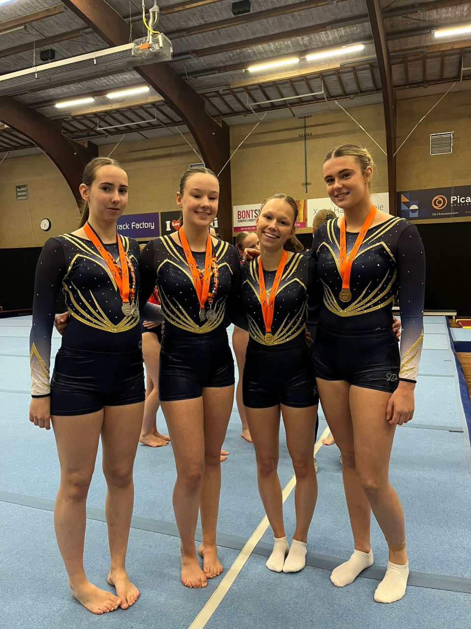 Het team supplement F 2, met Edie, Mara, Mirthe en Noa, maakte indruk met sterke oefeningen. Hun goede optreden werd beloond met een tweede plaats. Individueel waren er ook mooie resultaten: bij de jeugd werd Edie tweede en Mara vierde. Bij de junioren pakte Mirthe het zilver en eindigde Noa als vijfde.
