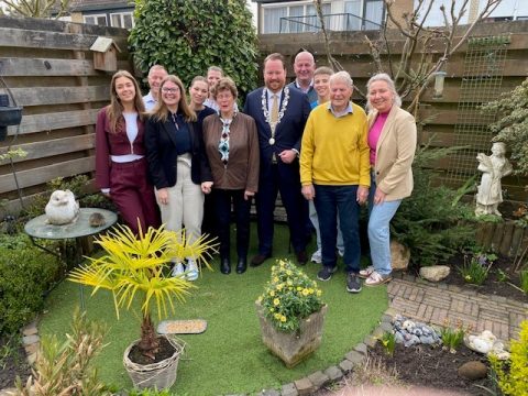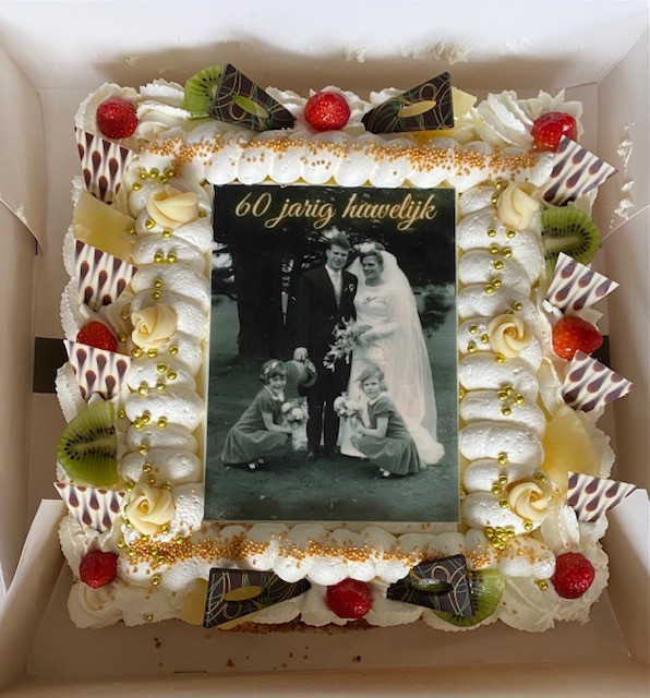 Maar zoals burgemeester Diepemaat het zei, voor de wet is 1 april geldig en daarom kwam hij natuurlijk op die dag om dit diamanten echtpaar persoonlijk te feliciteren en om een prachtig boeket bloemen te overhandigen. Het is een gezellige koffieronde met hun gezin erbij. Maar op 14 april wordt het groots gevierd met de hele familie.