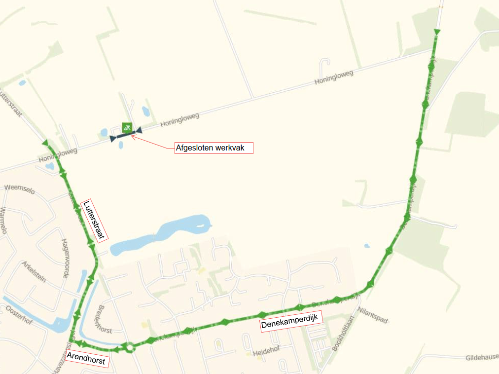 Om het werk te kunnen uitvoeren gaat de weg tussen de Lutterstraat en de Denekamperdijk dicht voor al het doorgaand verkeer. De aanliggende percelen blijven van één kant bereikbaar via de Lutterstraat of de Denekamperdijk.